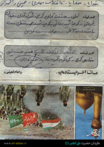 دنيا به گوش باش! اين مطلبي است كه از دل و ايمان يك رزمنده ايراني بپاست. من با آگاهي كامل اين راه را انتخابكردم و پا به عرصه جهاد گذاشتم تا ناآگاهان دنيا بفهمند كه با تحكم ايمانتان جان ميدهيم و شهادت را به جان ميخريم كه شايد پرتو خونمان ظلمت جهل را از دل اين زذيلان بزدايد و حق را دريابند. پس ای خدا مرا در اين امر موفق بدار.